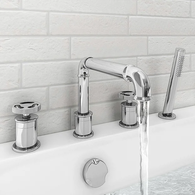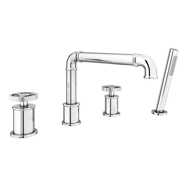 The stylish Arezzo industrial-style polished chrome 4 tap hole bath shower mixer tap is perfect for adding a striking finishing touch to your contemporary bathroom. Crafted to the highest standards, this stunning deck mounted tap features a stripped-down aesthetic with a round knurled textured tap heads, perfect for creating an eye catching industrial look in your bathroom. Plated in chrome which is highly resistant to corrosion. Tap has been designed to be recessed and comes complete with a pull out single function shower handset.Â