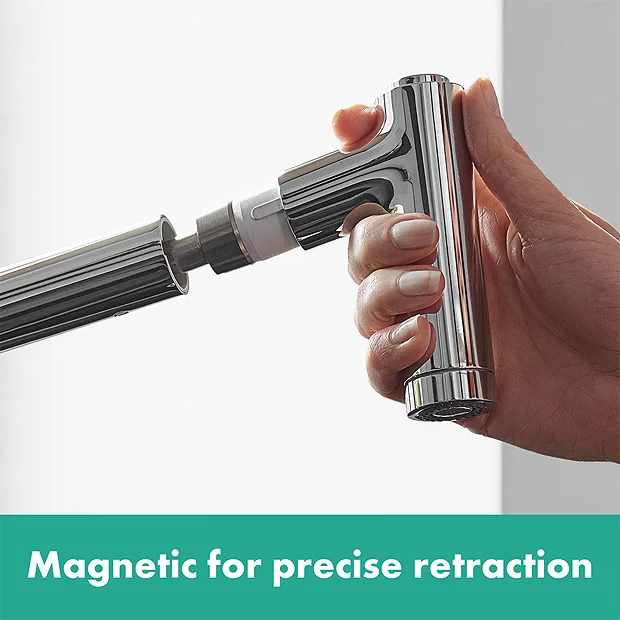 hansgrohe kitchen taps use water more efficiently and add a stylish highlight to any kitchen. The Metris M71 comes elegantly finished in scratch-resistant classic chrome, it features an ergonomic flat single lever symbolising the synthesis of sophisticated design with clever functionality. The QuickClean rub clean aerator loosens any limescale deposits making sure your tap looks beautiful, and stays working for longer.